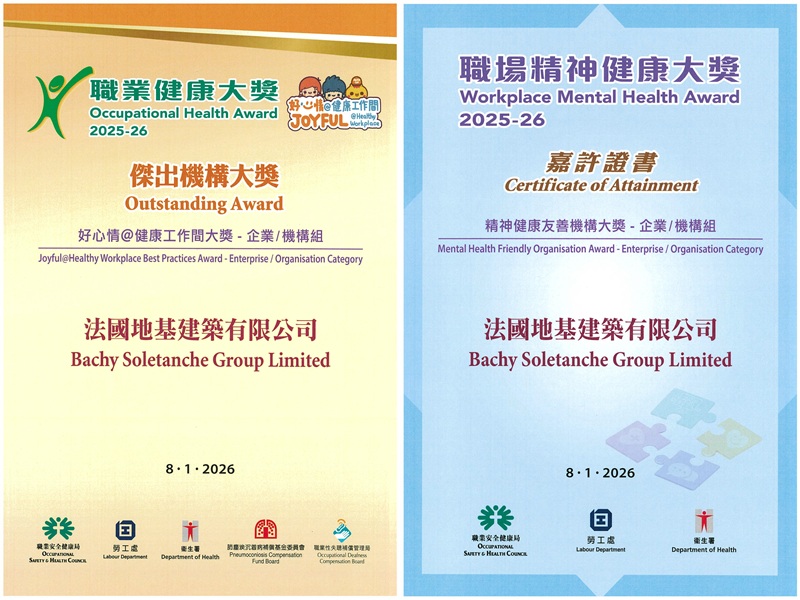 We are proud to announce that Bachy Soletanche Group Limited (BSGL) has been honoured at the Occupational Health Award & Workplace Mental Health Award 2025–26 Forum and Award Presentation Ceremony, jointly organised by: